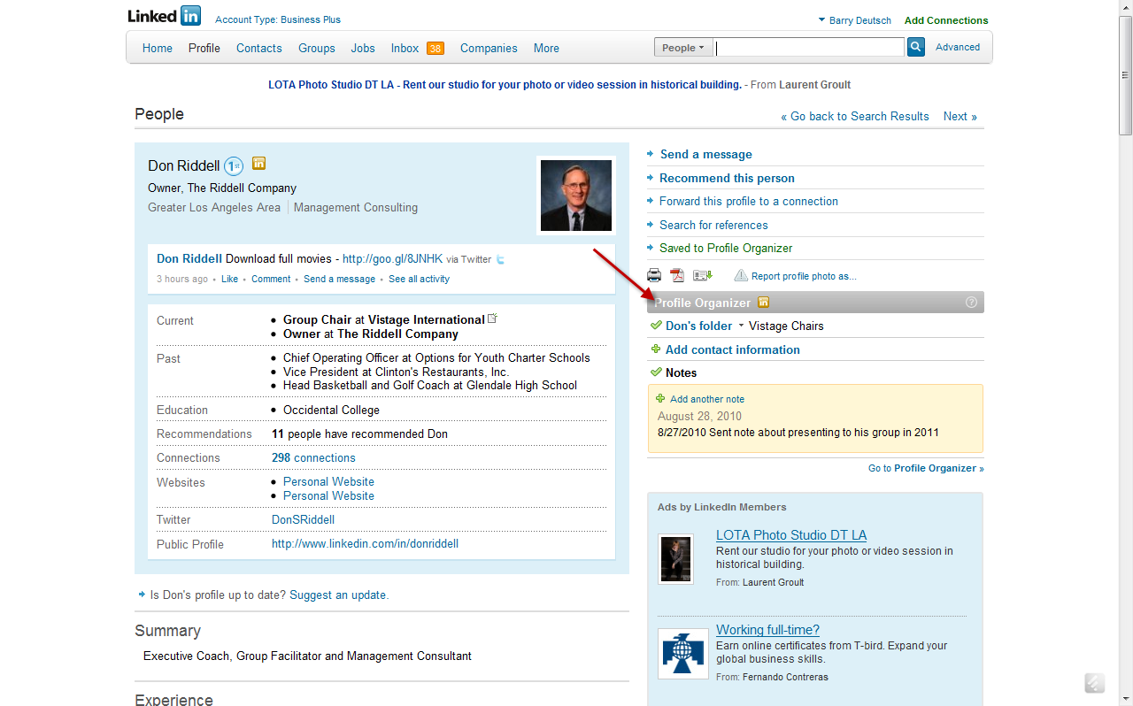 I assume you’ve upgraded your LinkedIn accounts to the Business Pro Version. If not, you should upgrade to Business Pro from the free version. Once you click on the profile of someone you would like to know better, add them to a “bucket” or “category” in your profile organizer on LinkedIn (see the screenshot below). The Business Pro Version gives you access to the "Profile Organizer" which as both a category and tagging feature.