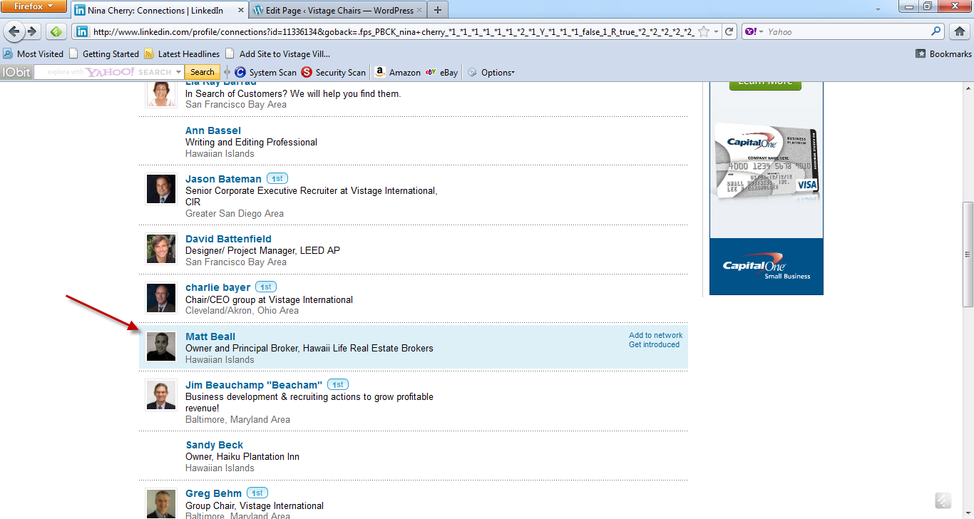 Here's an example of a potential CEO member listed as one of the contacts on Nina Cherry's list of contacts. Our next step might be to click on the person's name, read about their background to validate they are worthy of a follow-up, and look at how you're connected to them? In this specific example, I would see that Matt is connected to Nina. I might call or email Nina and ask her if she would be open to providing an introduction.
